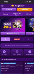 - Kingmaker – renomowany bukmacher z ogromną ofertą promocji dla graczy, w tym cotygodniowym bonusem sportowym 50% do 2250 PLN, zwrotem przy bezbramkowym remisie oraz cashbacku 10%.